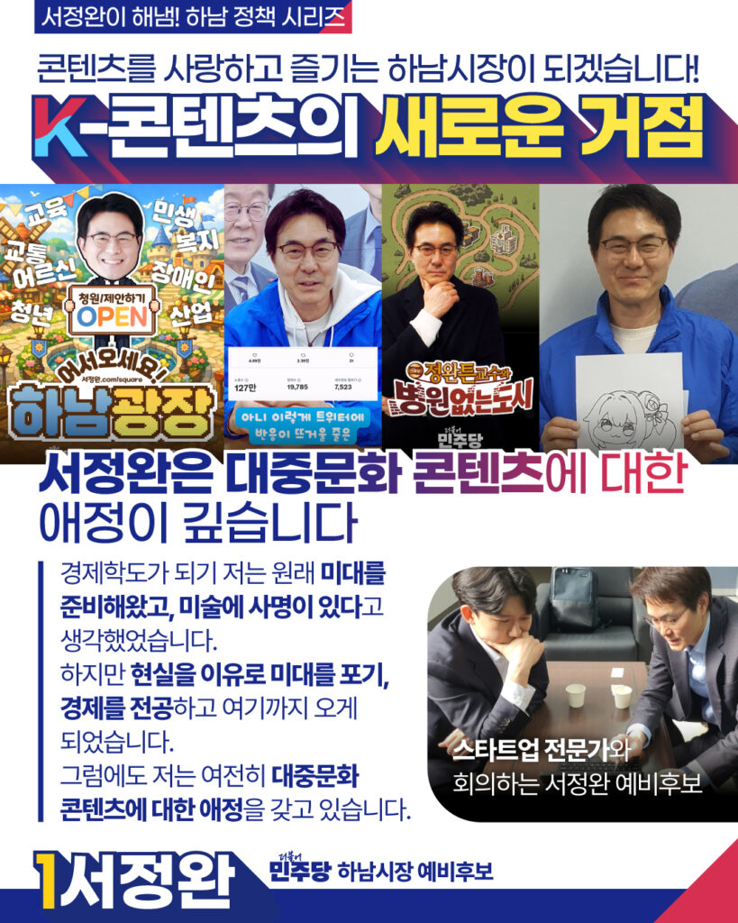 [서정완이 해냄! 하남 정책 시리즈] 콘텐츠 스타트업의 새로운 거점 콘텐츠밸리 조성하남 정책 게임, 웹툰, 유튜브 등 K-콘텐츠 시장을 선도할콘텐츠 스타트업의 새로운 거점을 만들겠습니다!하남발전은 누가 하남? 서정완이 해냄!