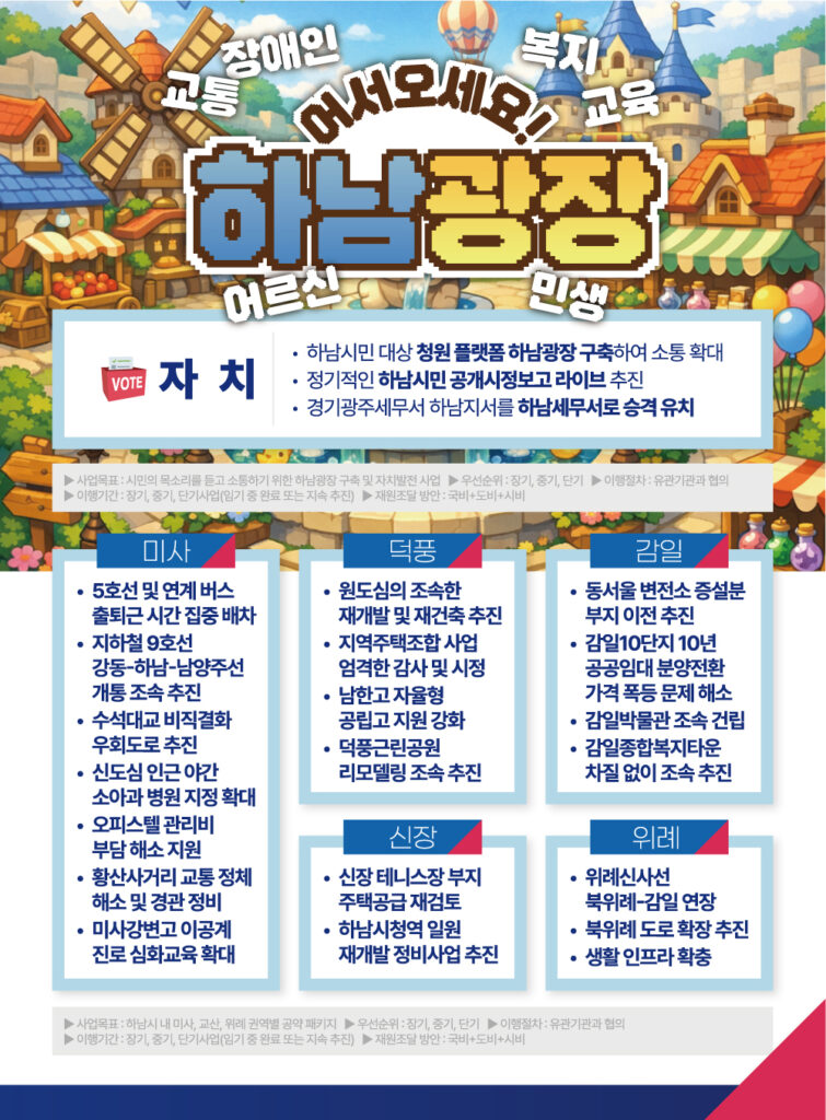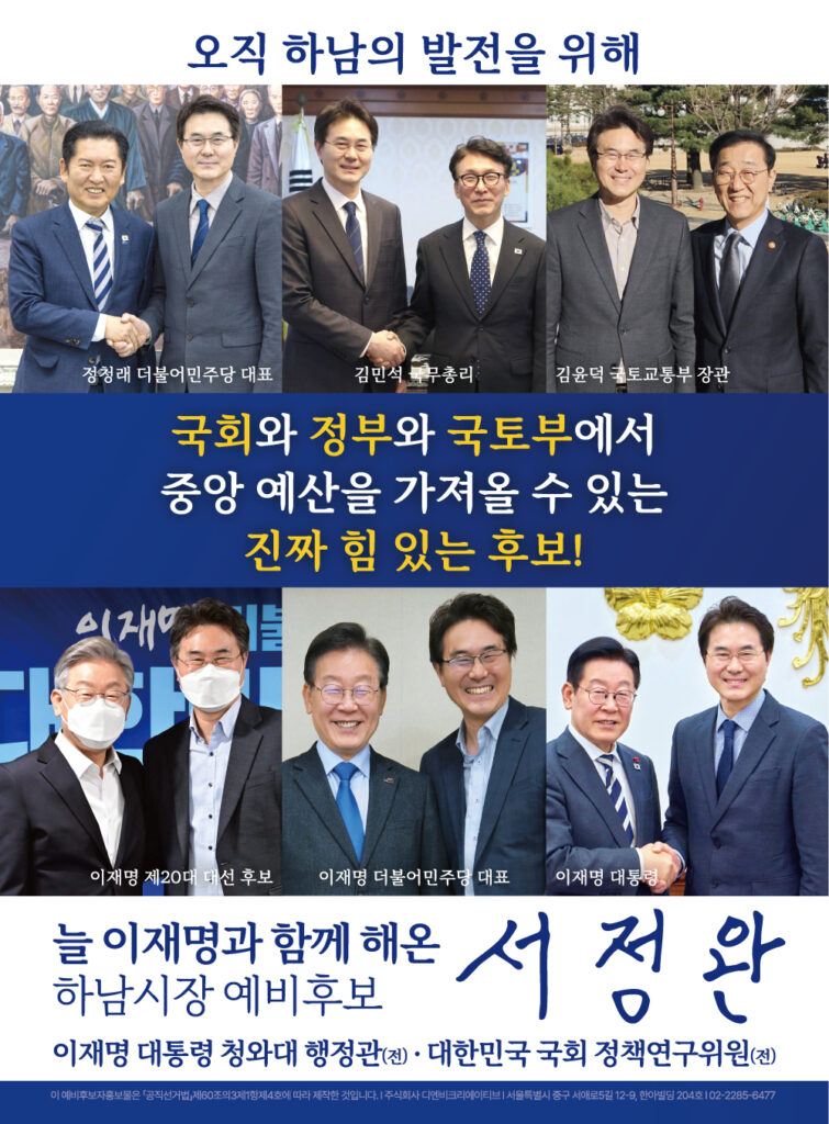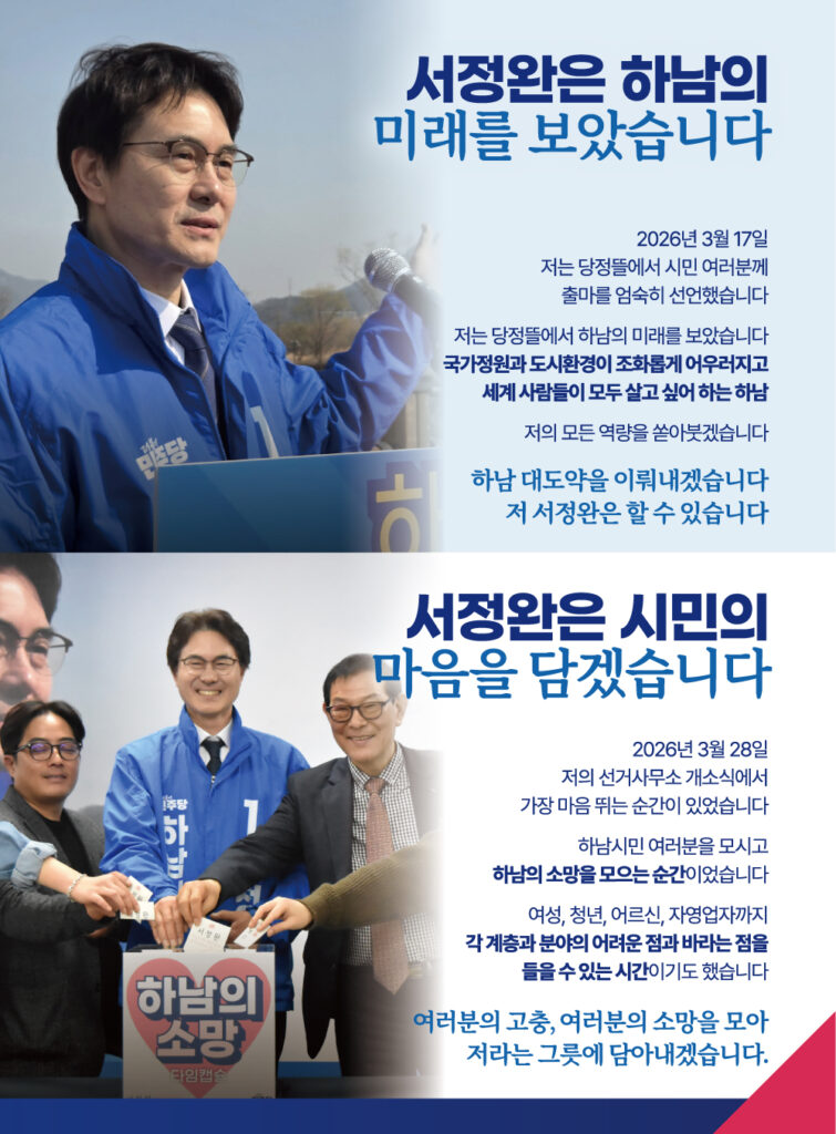 < 하남시장 예비후보 서정완 홍보물 대공개! >하남 소식 몇 주 전부터 정성스럽게 준비한서정완 예비후보자홍보물을 대공개합니다! 당과 대한민국에 헌신한 저의 일생과하남을 위한 중점사업 및 다양한 공약을 담았습니다. 많은 분들의 일독을 부탁드립니다. 감사합니다!