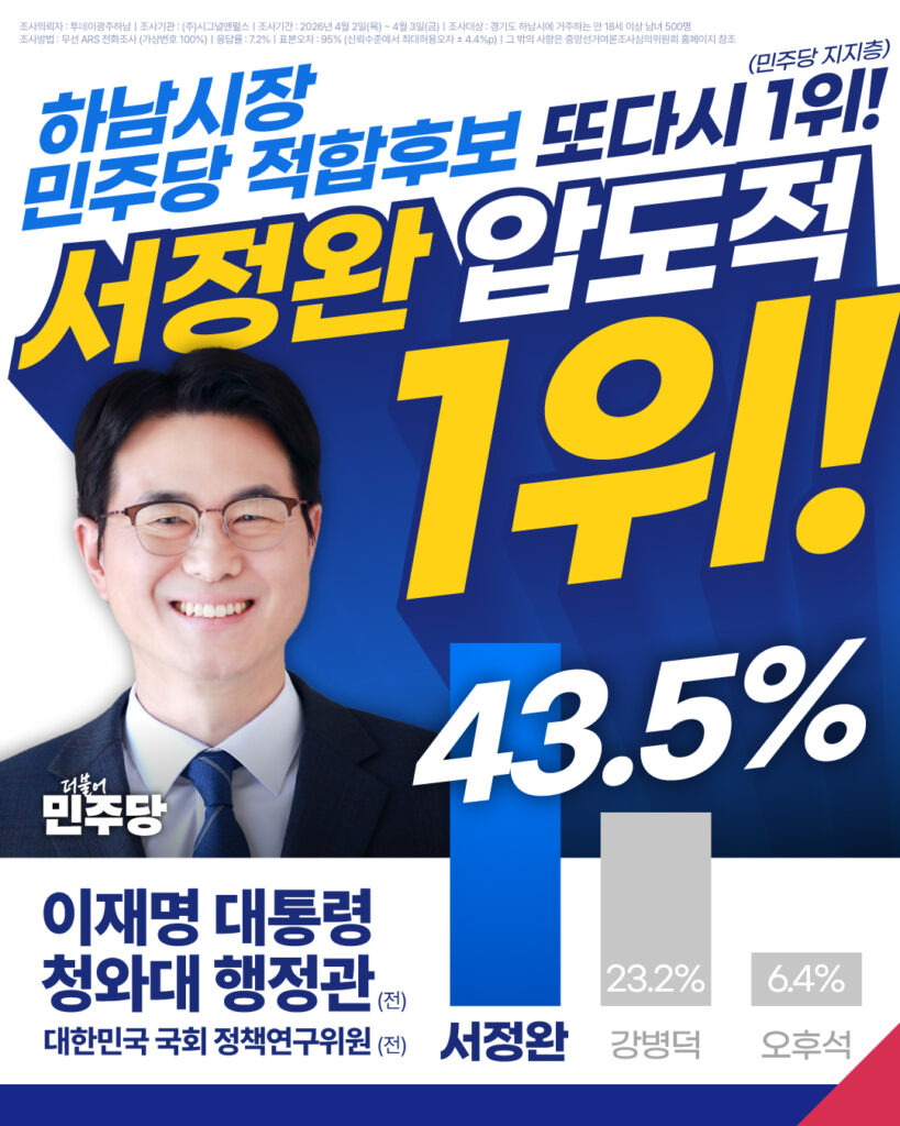 4월 4일 발표된 하남시장 여론조사에서민주당 적합후보에 저 서정완이 또다시 1위에 올랐습니다! 이 기세를 몰아 무능력, 무관심, 무모한 ‘3무’ 국힘 시정을
