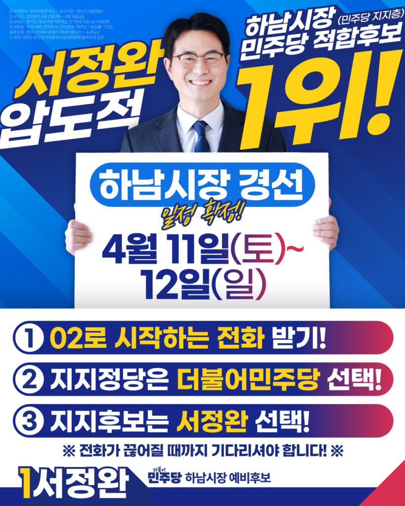 하남시장 민주당 적합후보 1위 서정완! (민주당 지지층 대상)하남시장 경선 일정이 아래와 같이 확정되었습니다! 🔷 하남시장 경선일정 : 4월 11일(토) ~