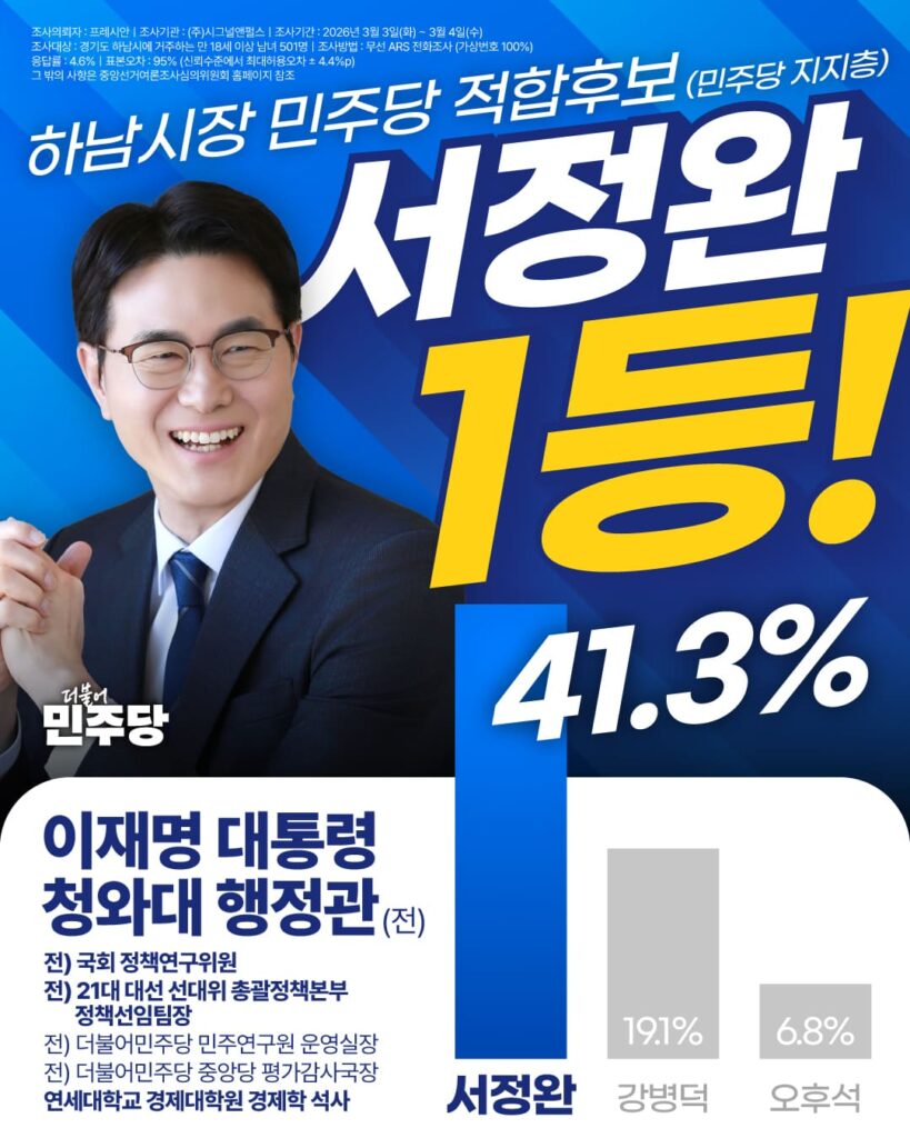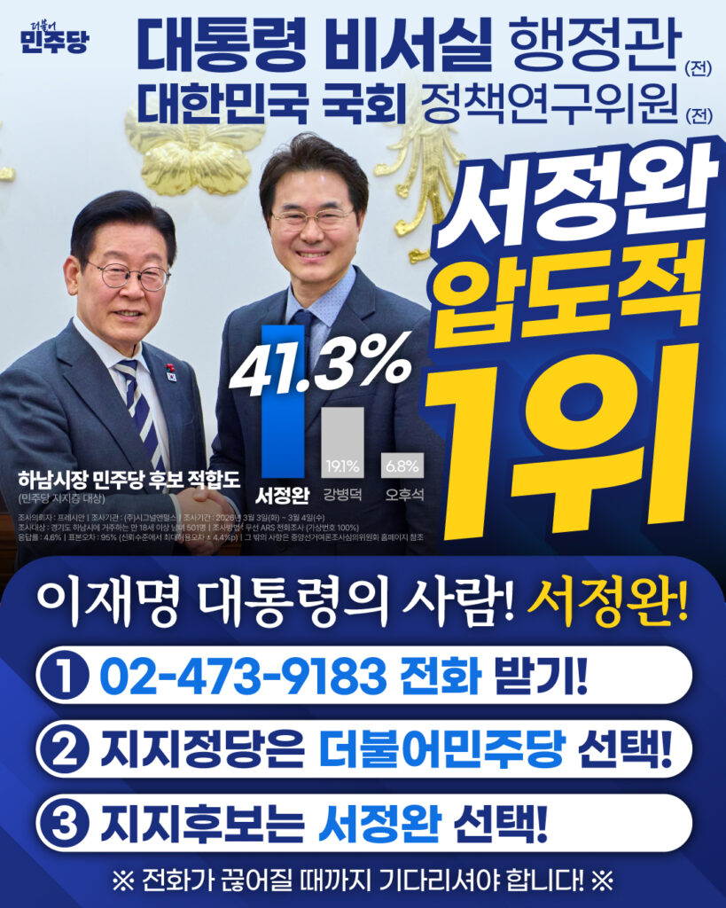 – 대통령 비서실 행정관 (전)– 대한민국 국회 정책연구위원 (전) 서정완 하남시장 민주당후보 적합도 압도적 1위!(민주당 지지층 대상) 02-473-9183 전화를 꼭