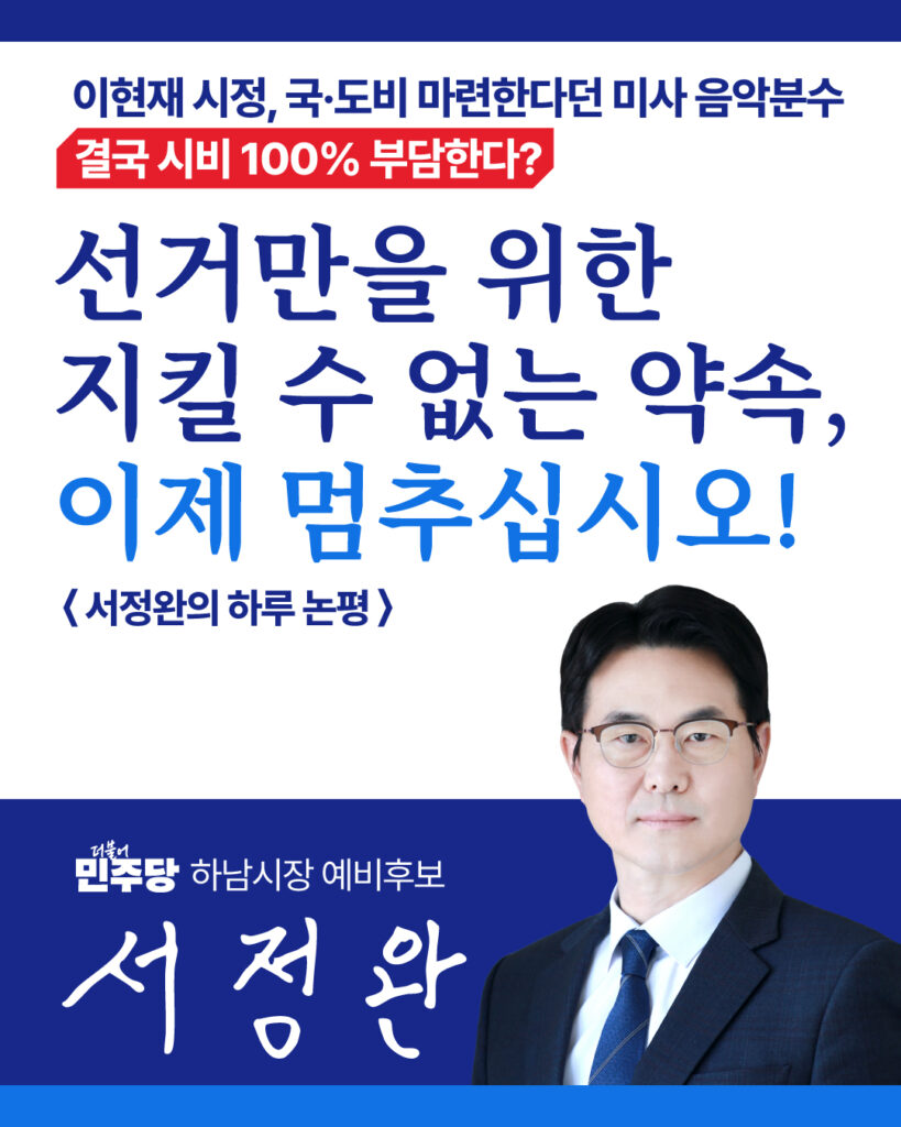 존경하는 하남시민 여러분! 저 서정완은 어제 우리 하남의 소중한 자산인 당정뜰 한가운데서 제9회 전국동시지방선거 하남시장 출마를 엄숙히 선언했습니다. 지금 하남은