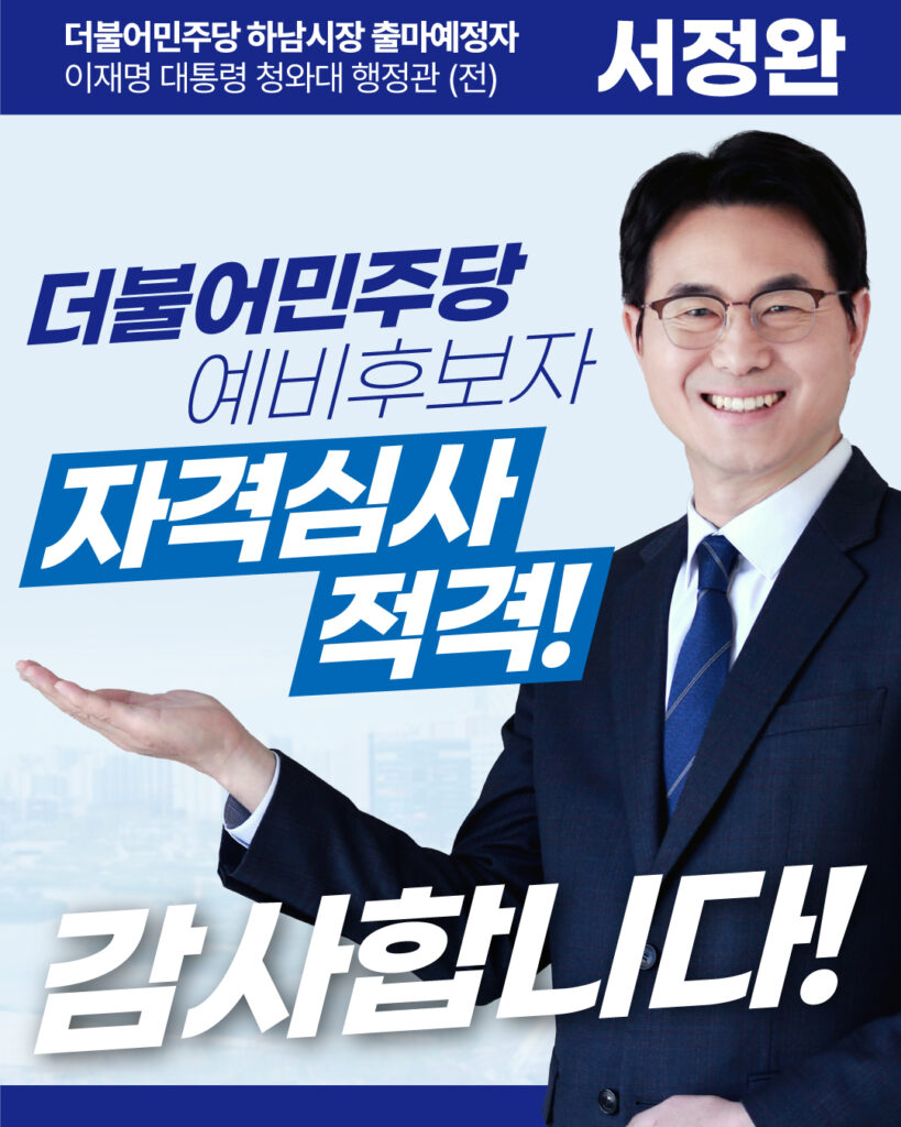 존경하는 하남시민 여러분, 그리고 당원 동지 여러분! 저 서정완이 더불어민주당 예비후보자 자격심사를 당당히 통과했다는 기쁜 소식을 전해드립니다. 이제 신발 끈을